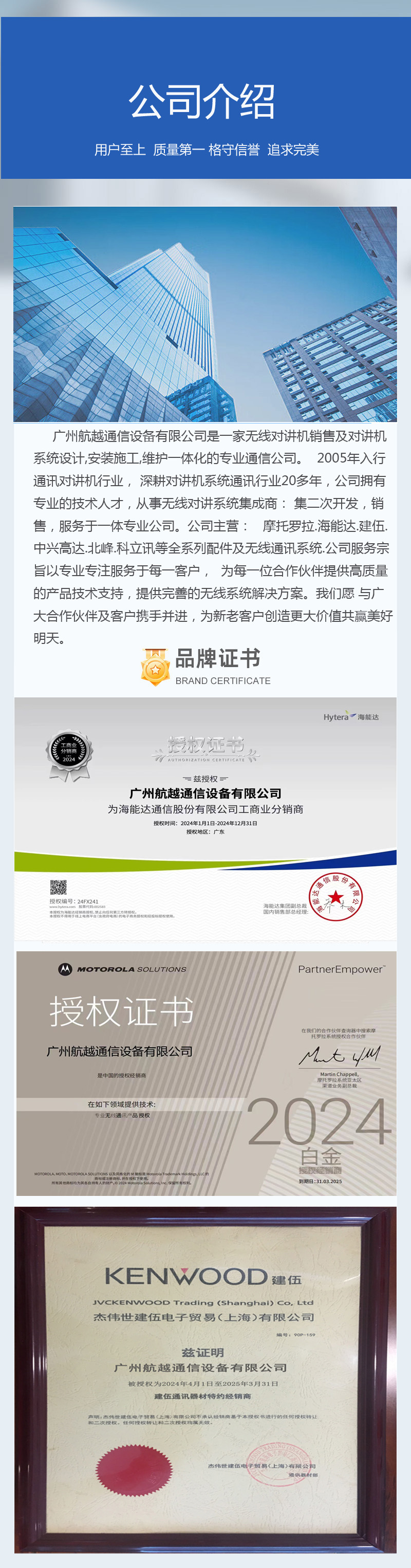 摩托羅拉、建伍、海能達、建威官方授權認證。